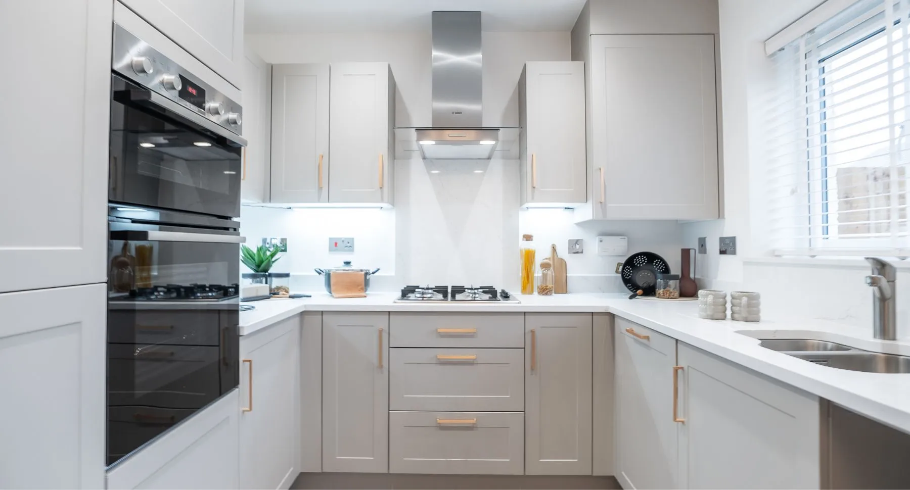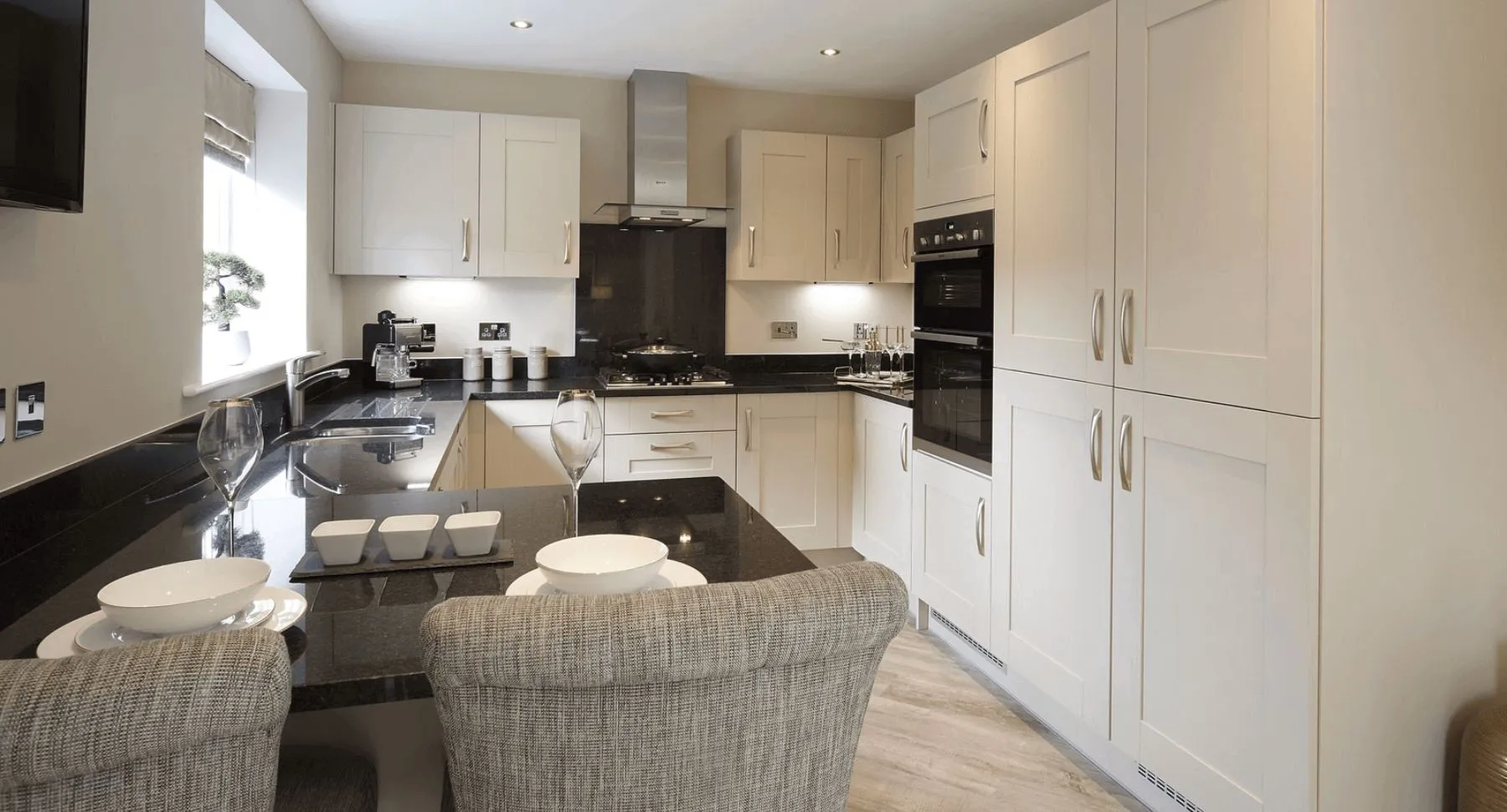 For first time buyers or those looking to downsize, The Cranford is a stylish two-bedroom mews home, perfect for those seeking new build homes in Wilmslow. The ground floor features a living room, leading through to a modern open-plan kitchen and dining room with patio doors leading out to the back garden, ideal for modern living and entertaining. The Cranford’s contemporary kitchen features beautiful laminate worktops and upstands, with lights under the wall units and Bosch integrated appliances.