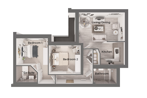 A 2 bedroom, 2 bathroom apartment designed for modern, convenient living. Its spacious open-plan layout and two bathrooms create a home that is practical and perfectly appointed.